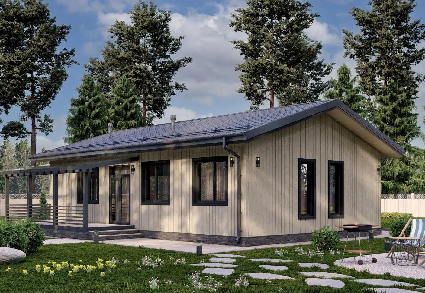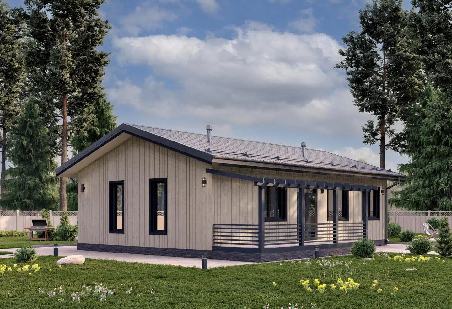 • Покрытие кровли - Гибкая битумная черепица с цветным каменным гранулятом;