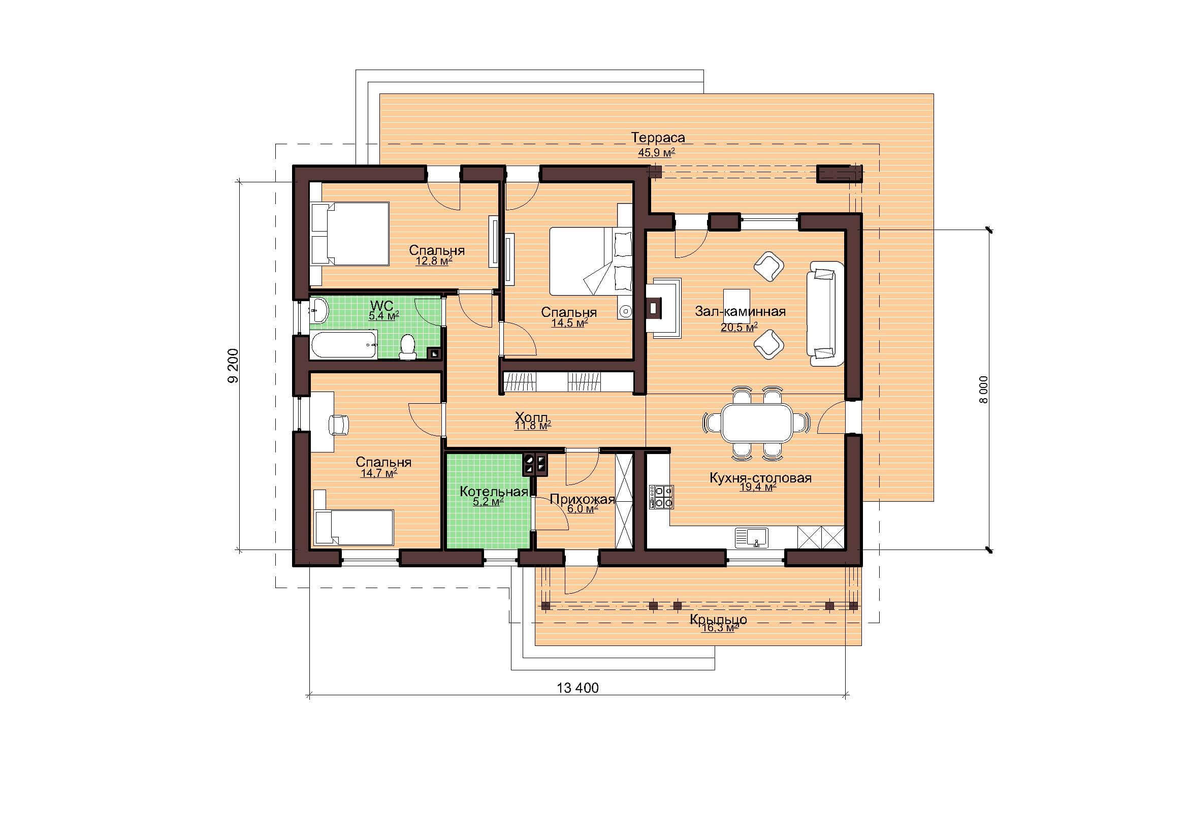 Размер дома 13,4х9,2