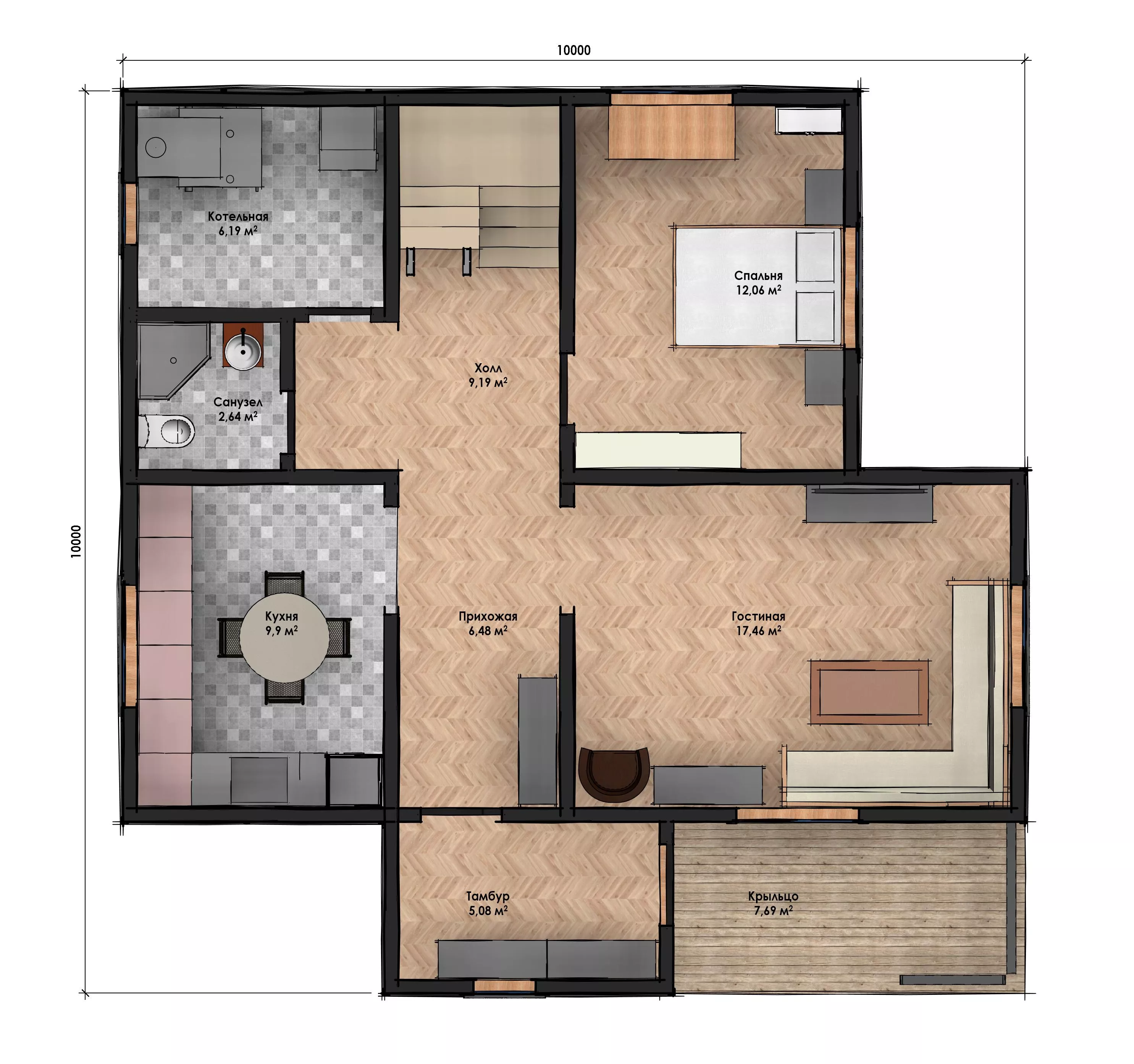 • Покрытие кровли - Гибкая битумная черепица с цветным каменным гранулятом;