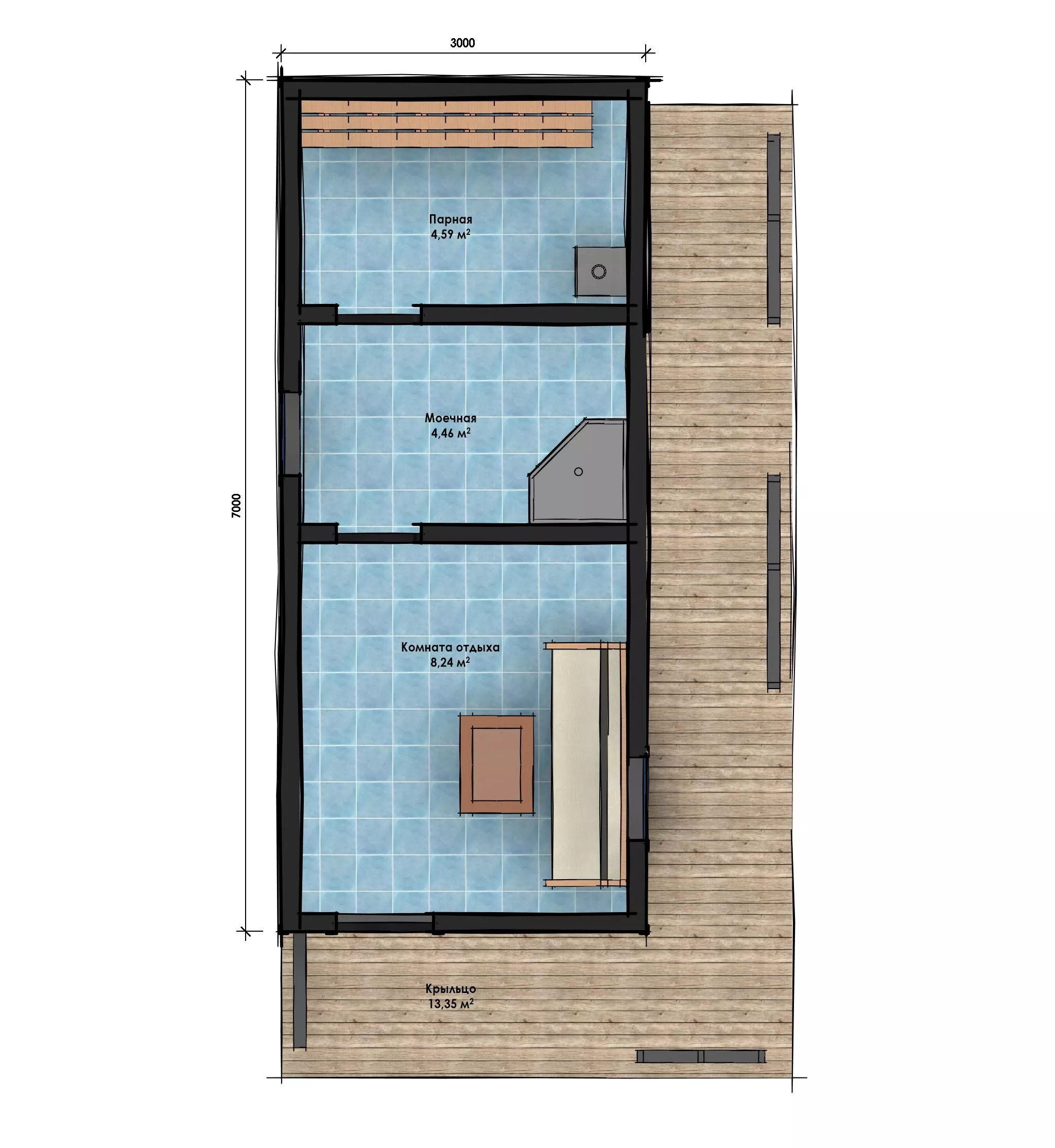 • Покрытие кровли - Гибкая битумная черепица с цветным каменным гранулятом;