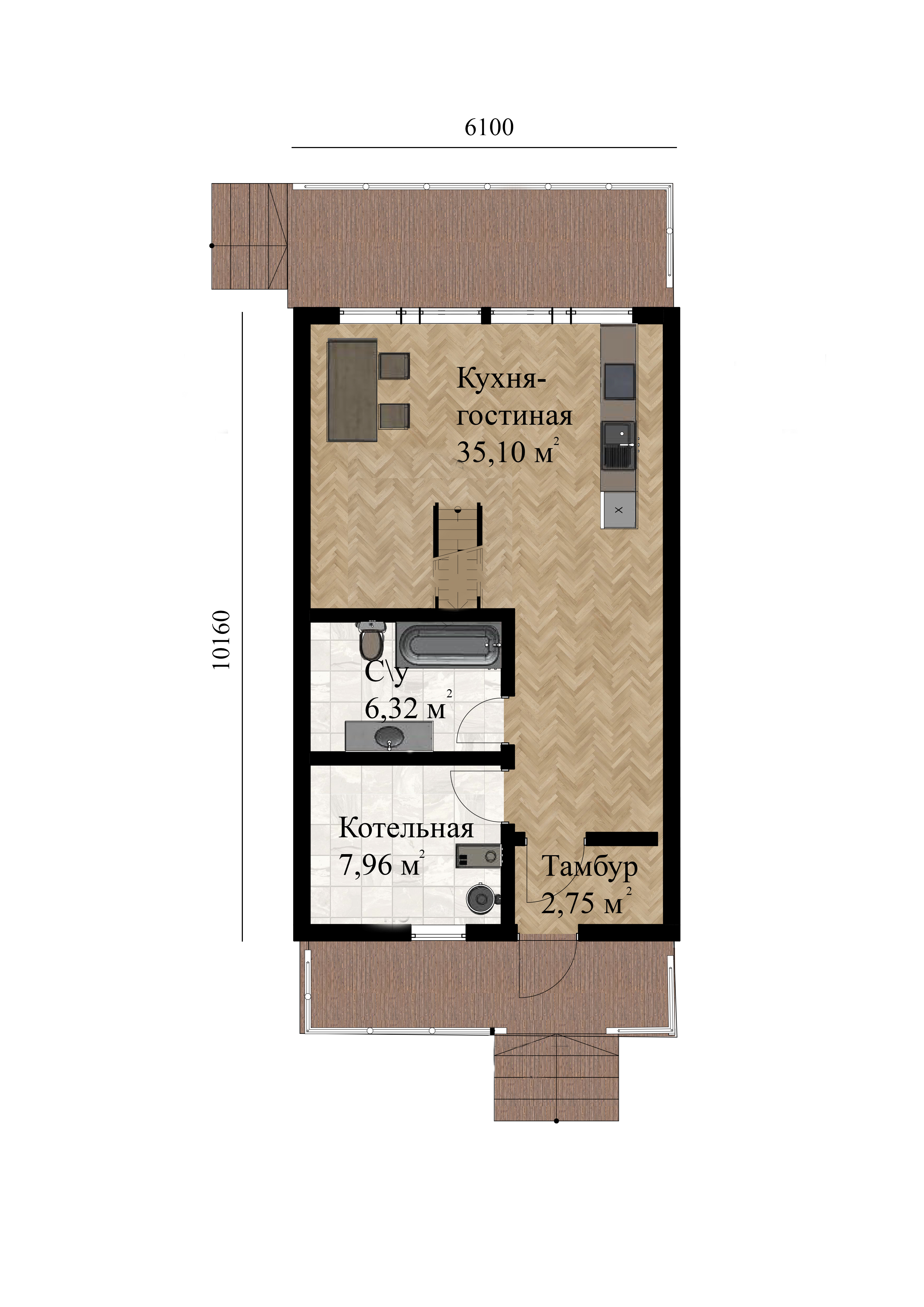• Покрытие кровли - Гибкая битумная черепица с цветным каменным гранулятом;