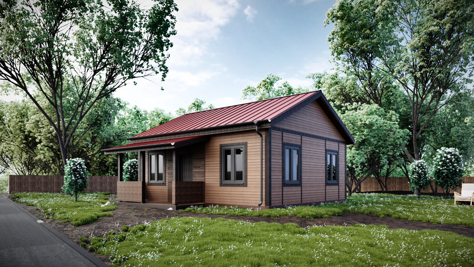 • Покрытие кровли - Гибкая битумная черепица с цветным каменным гранулятом;