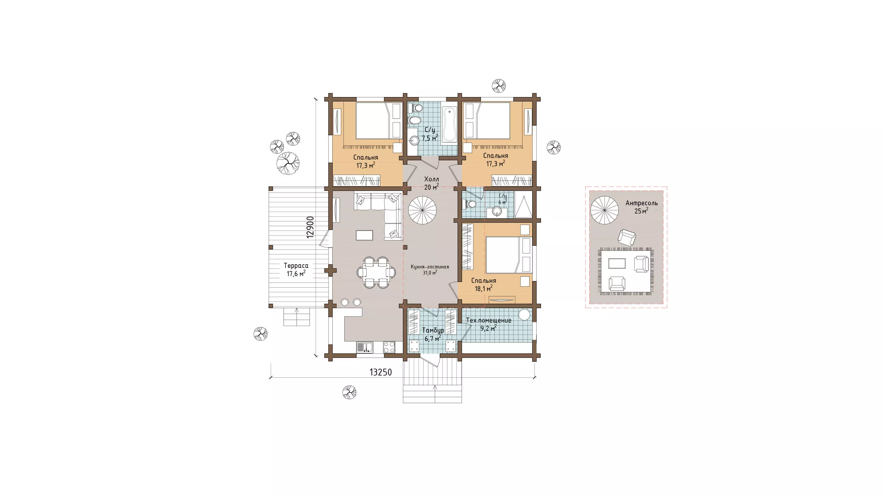 • Покрытие кровли - Гибкая битумная черепица с цветным каменным гранулятом;