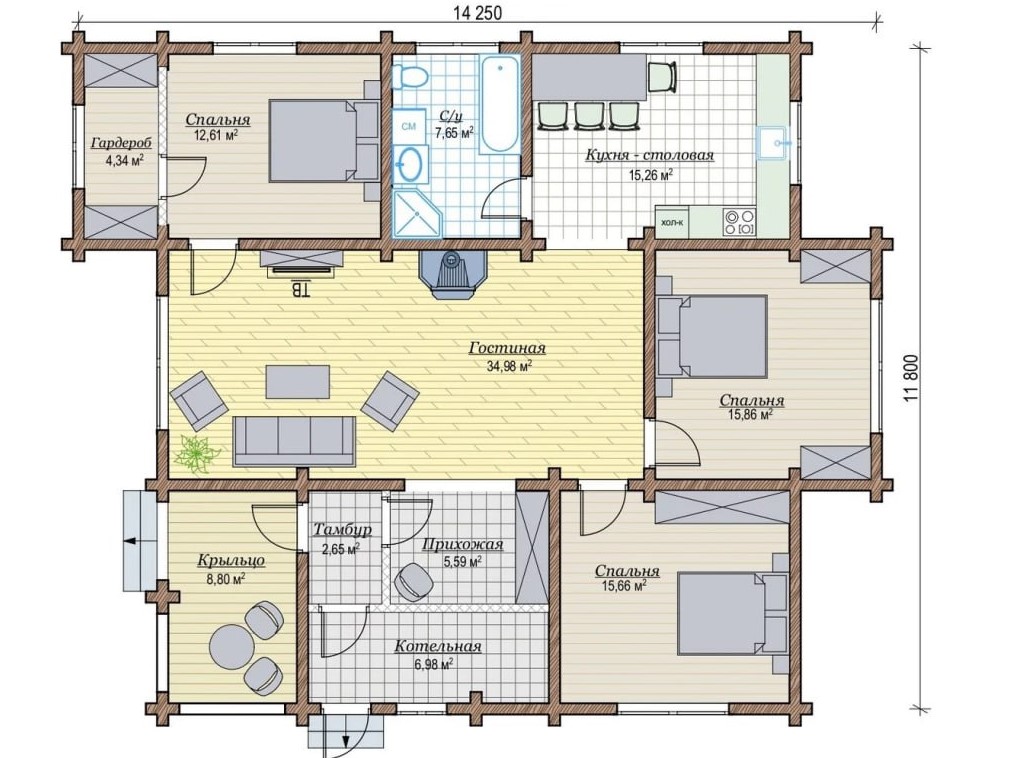 • Покрытие кровли - Гибкая битумная черепица с цветным каменным гранулятом;