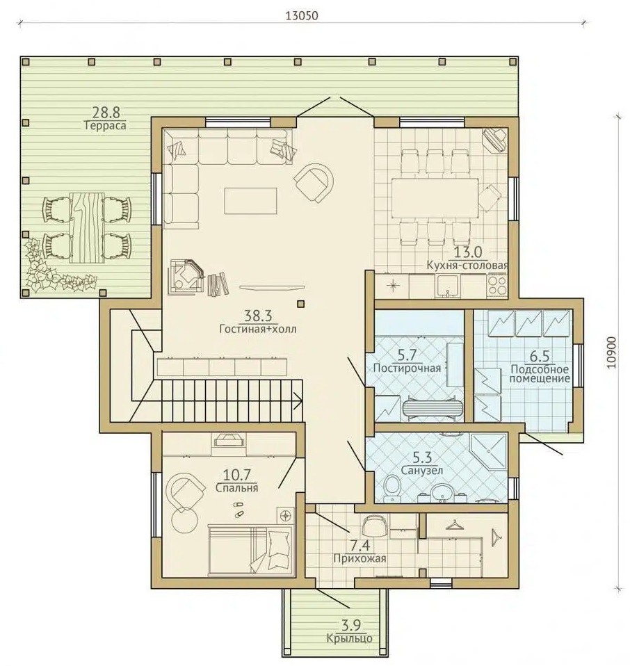 • Покрытие кровли - Гибкая битумная черепица с цветным каменным гранулятом;